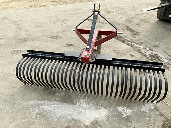 New 124206 heavy duty six-foot 3 pt. landscape rake, tines mounted to 5" channel, 10 position adjustment, weighs 239 lbs., red/black color, Cat I lower pins.