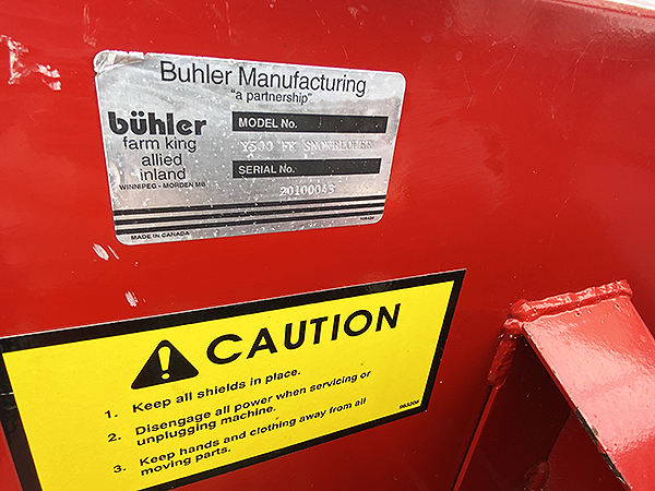 Description: Buhler Farm King 500 50" 3 pt. 2-stage snowblower, 540 PTO, manual hand crank chute control.