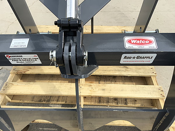 Description: Walco 148336 (Precision # 339S27) adjustable "pallet fork" Add-A-Grapple, three height settings up to 74". Includes cylinder (less hoses and male hydraulic ends), and less actual pallet fork set required to use grapple. Note: This "pallet fork" Add-A-Grapple has been sold, but please call for current price and availability of a new unit. 07/19/2022.