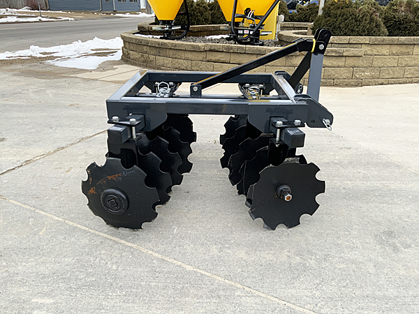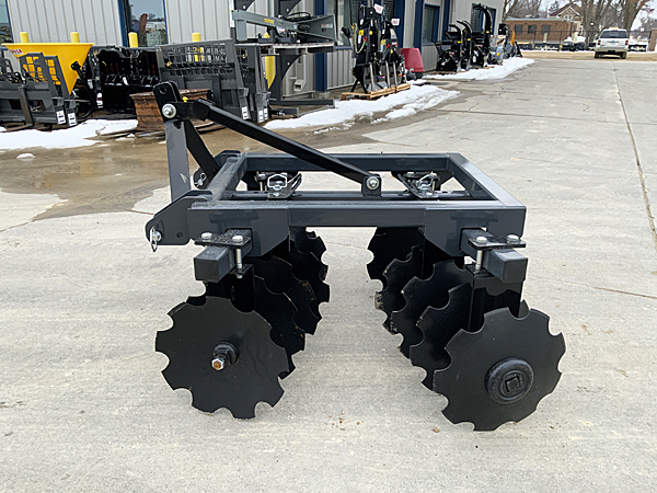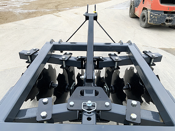 Description: New SC Midland DH30-60N-CH 60" disk harrow, Cat I 3 pt. hitch, quick hitch compatible, 18" notched blades on front and rear gangs, 7½" blade spacing, 1⅛" square gang bolts, self-aligning seal bearings, adjustable gang angle on both front and rear, 3" square tube frame, charcoal gray color. Can be used to fill in trenches from center pivot irrigation tires. Lists @ $3,410 includes factory freight and setup. We have two units in stock. 04/04/2023