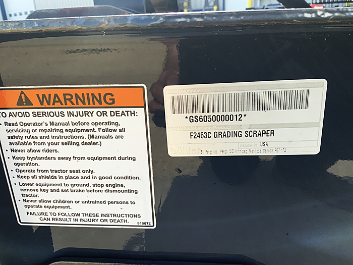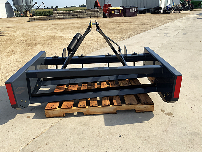 Description: New Buhler Farm King 60" 3 pt. grading scraper, two blades reversible with 1/2" X 6" cutting edge, 18" blade spacing, reversible/replaceable steel skid shoes, 4 adjustable scarifier shanks with four depth settings, Cat I/II quick hitch compatible, 20-55 hp required, length 49", height 34", weighs 534 lbs., charcoal color, list price $2,222, plus shipping. 09/15/2025
