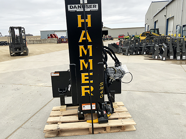 New Danuser 21003 SM40 hammer with tilt and grapple, has a 40" drop hammer design. The grapple option allows the operator to grab the post off the ground, load into the machine and drive it into the ground without leaving the SSL seat. Includes hoses with flat face couplers. Lists @ $11,240 with factory freight to Werner Implement.