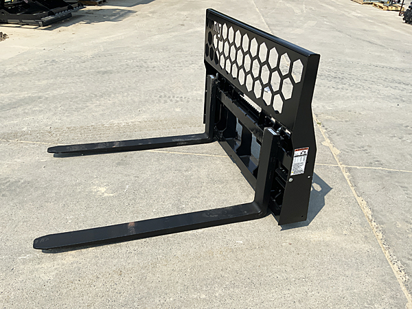 New Walco 124804 Euro-Tach 3700 lb. rail style pallet fork set w/48" long forks. Brick guard is 45½" wide. (42" long forks are an option). Also available with universal SSL Q-tach mount plate with 48" or 42" long forks. Price is same as Euro-tach 48" forks.