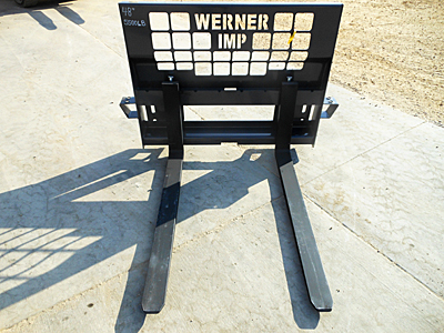 New Virnig PFWT 4855 48" 5,500 lb. pallet fork set, 45.5" wide fork frame, walk-through design, weighs 390 lbs., comes with step and hardware to bolt on either side. Lists @ $1,370.