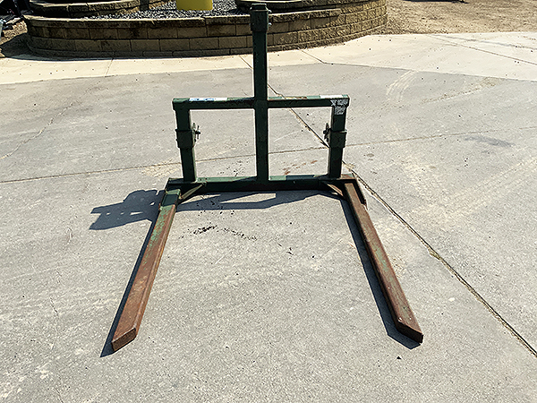 Used Double L model E510 1,500 lb. capacity 3 pt. round bale fork, Cat II pins, 50" long forks. Forks are 3" wide x 2" thick, width 46" outside to outside. Adjustable upper and lower mounts.
