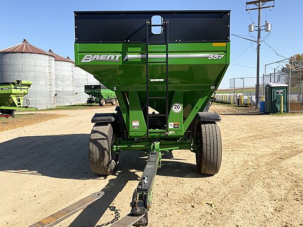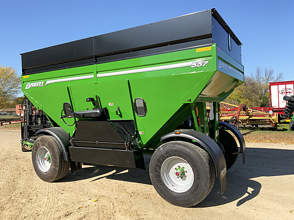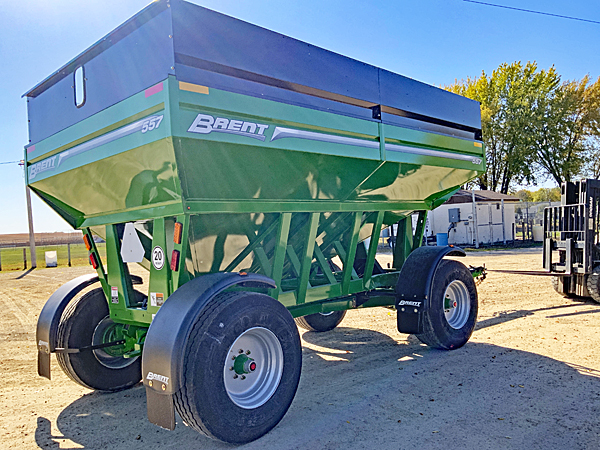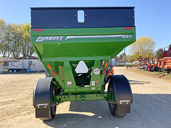 Description: New 2023 Brent 557 grain wagon, 550 bushel capacity, left hand unload, 425/65R22.5 used truck tires, factory installed fender kit. Green in color, transport chain, two wheel surge brakes, transport and work lights, center dump deflector chute. Listed @ $32,300, before freight and setup. Note: This grain wagon has been sold, but please call for current price and availability of a 2024 model.