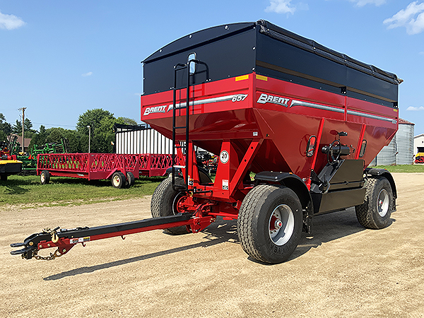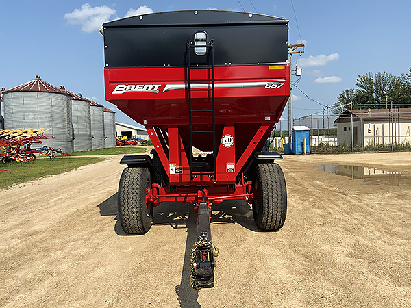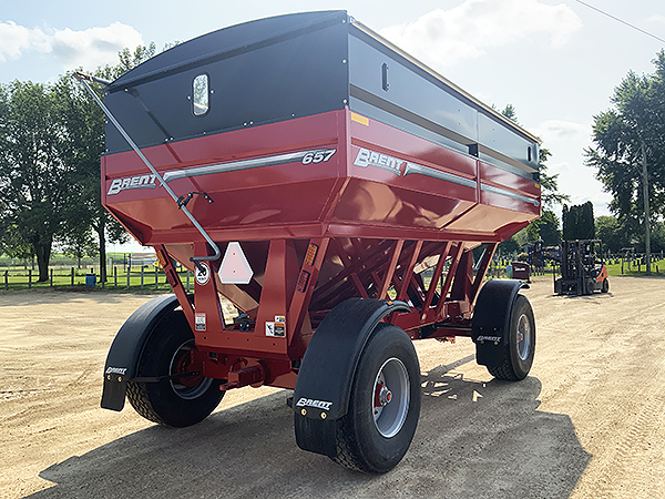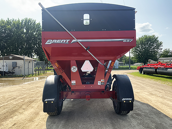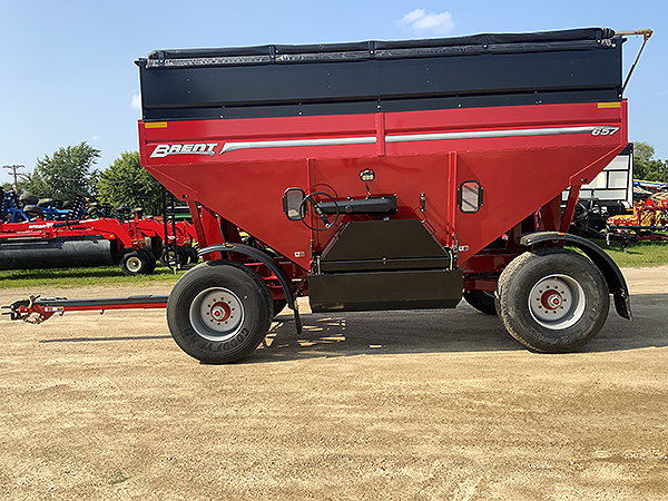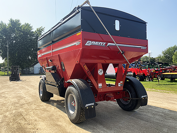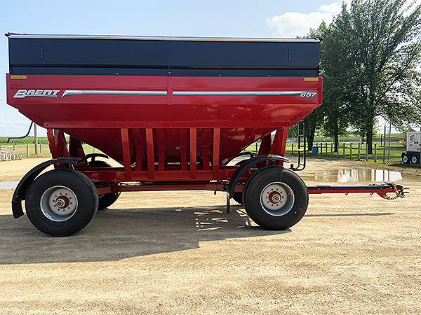 Description: New 2024 Brent 657 grain wagon, 650-bushel capacity, left hand unload, 445/65x22.5 used truck tires, factory installed fender kit, transport safety chain, four-wheel surge brakes, factory Weather Guard roll tarp, transport and work lights, center dump deflector chute. Lists @ $40,700, plus freight & setup. 09/22/2025