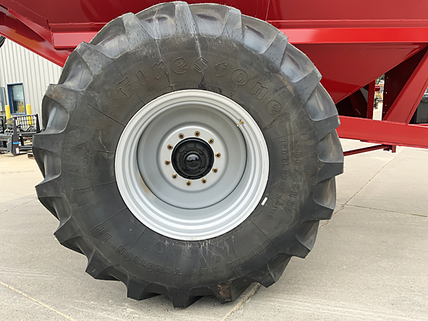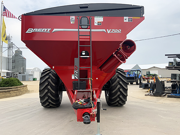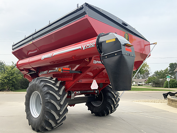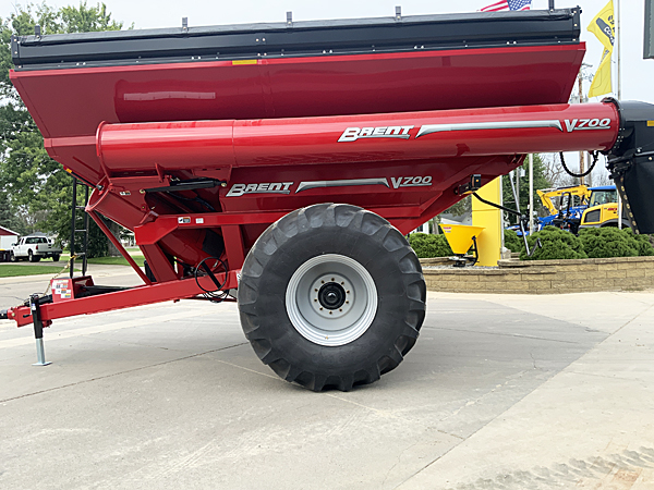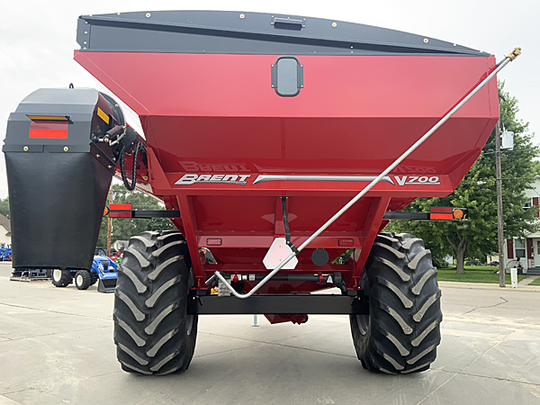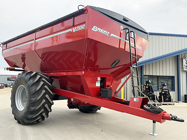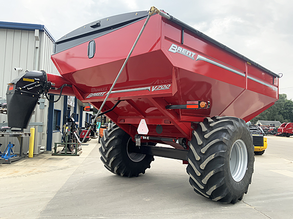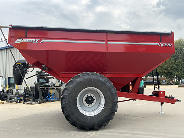 Description: 2024 Brent V700 750+ bushel corner auger grain cart, 18" diameter auger, 1⅜" 21-spline shear bolt clutch, four-way downspout, single tang hitch bar, safety transport chain, LED transport light kit, 800/65X32 R-1W (172A8L1) Firestone tractor lug tires, factory installed Weather Guard roll tarp, 124" rigid axle. 09/20/2025
