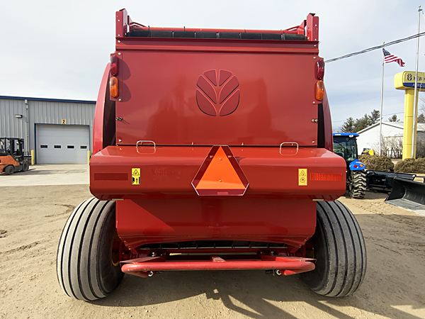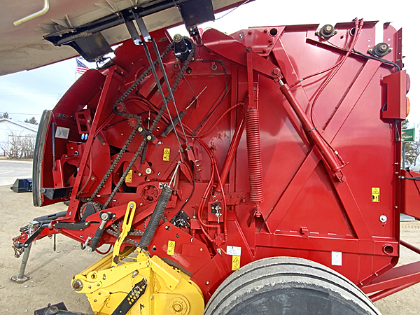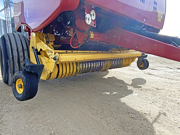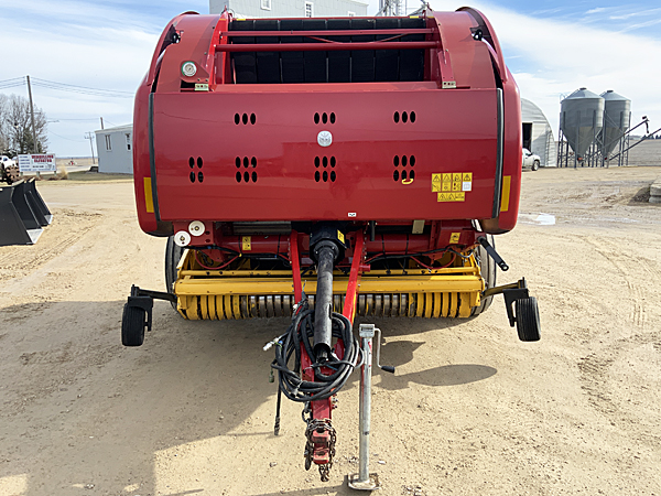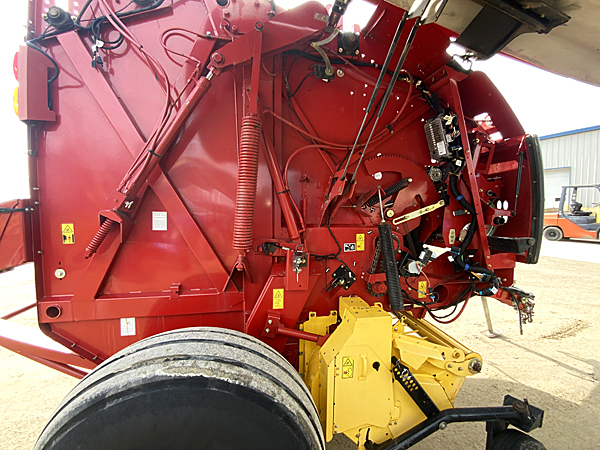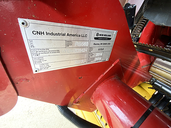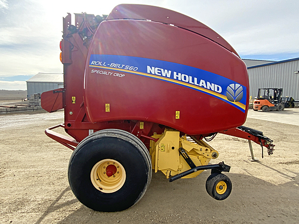Description: Used 2014 New Holland 560 Roll-Belt Specialty Crop round baler, 5' wide X 6' diameter bale, net and twine wrap, 1,000 rpm PTO with cut-out clutch, 2.07m 5-bar pickup with roller windguard/hydraulic lift kit and castering dual pickup wheels, endless belts, clevis hitch, 21.5LX16.1 10-ply flotation tires, touch screen monitor. Serviced through shop. Bale count: 3,671 bales.