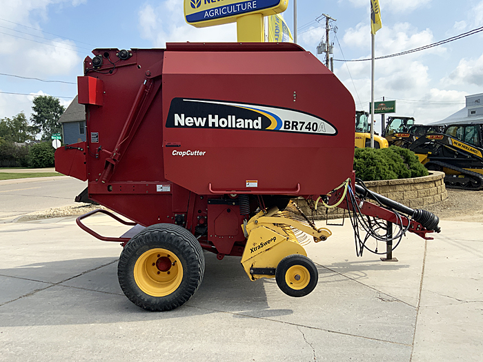Used New Holland BR750A round baler, Bale Command with twine and net wrap, 4-foot wide by up to 6-foot diameter bale size, XtraSweep pickup, hydraulic pickup lift kit, chain oiler kit, transport light kit, bale bumper, 14,889 bales.