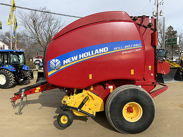 Used 2014 New Holland 560 Roll-Belt Specialty Crop round baler, 5' wide X 6' diameter bale, net and twine wrap, 1,000 rpm PTO with cut-out clutch, 2.07m 5-bar pickup with roller windguard/hydraulic lift kit and castering dual pickup wheels, endless belts, clevis hitch, 21.5LX16.1 10-ply flotation tires, touch screen monitor. Serviced through shop. Bale count: 3,671 bales.