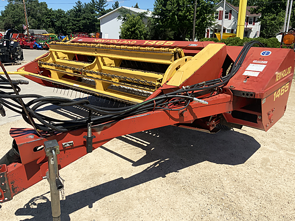 1999 New Holland 1465 haybine mower conditioner, standard guards, hydraulic tongue shift, hydraulic header lift cylinder, transport lights, 5-bat reel, good cutter bar and conditioner rolls. Serviced through shop. Very clean, straight unit.