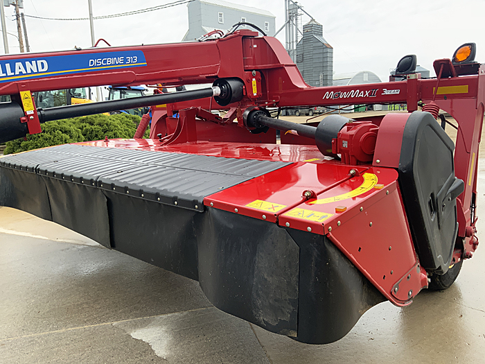 2022 New Holland 313R 13-foot discbine mower conditioner with rubber conditioner rolls, drawbar swivel hitch, transport lights, quick-change knives (new knives just installed), 1⅜" 21-spline 1,000 PTO. Serviced through our shop. One owner. Low acres, in like new condition.