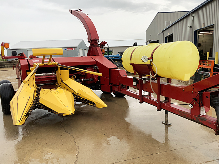 2006 New Holland FP230 forage harvester, walking tandem axle, 1⅜" 1,000 RPM PTO, Metalert III, crop processor, 12-knife cutter bar, adjustable spout with spout liner, hydraulic tongue swing, applicator, safety tow chain, transport light package, controller for the FP230 and the applicator. Includes New Holland 27P windrow forage header and New Holland 824 2-row narrow corn header. Serviced through our shop.