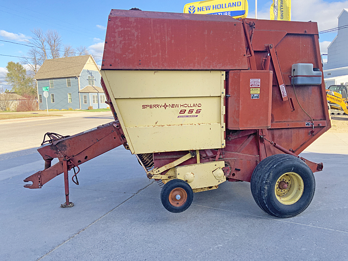 1984 New Holland 855 round baler, auto-wrap twine tie, dual pickup wheels, 540 RPM PTO, conveyor chain oiler, bale bumper, low bale count. Baler is in good mechanical condition. Paint condition is poor.