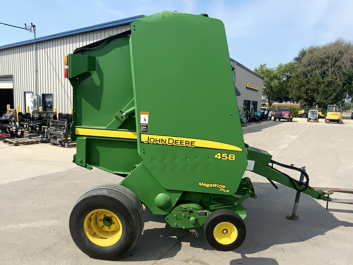 Used John Deere 458 round baler, twine wrap with in-cab controller, 4' wide by up to 5' diameter bale size, MegaWide Plus pickup with roller windguard and two pickup gauge wheels, flotation tires, transport lights, 540 CV PTO. Bale count 12,211 bales. Very good, sharp, clean baler.