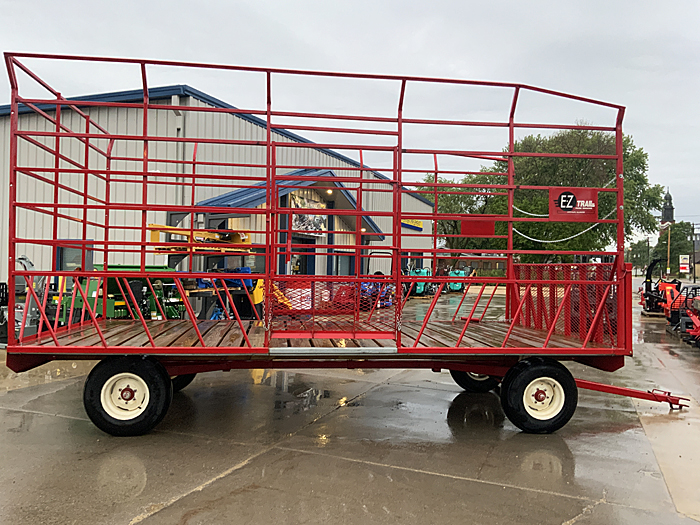 Used EZ Trail 9 X 18 bale throw rack, fold-down front gate, unload from either side, fold-down step on both sides, EZ Trail 872W 8-ton wagon running gear, 11LX15 American Farmer 8-ply tires with tubes. Extension tongue. New condition.