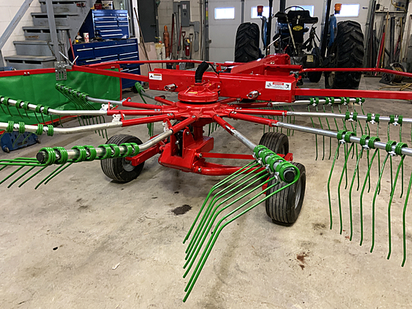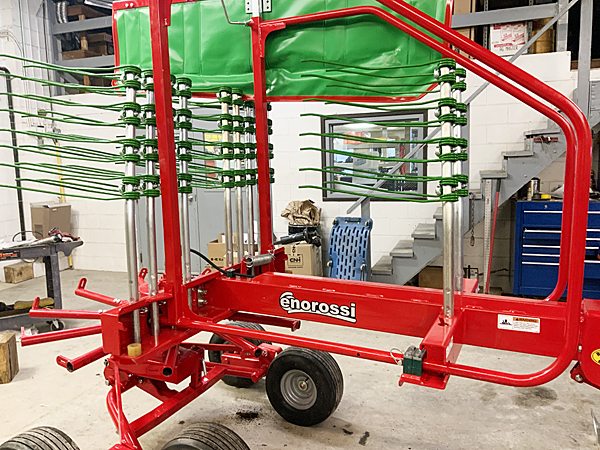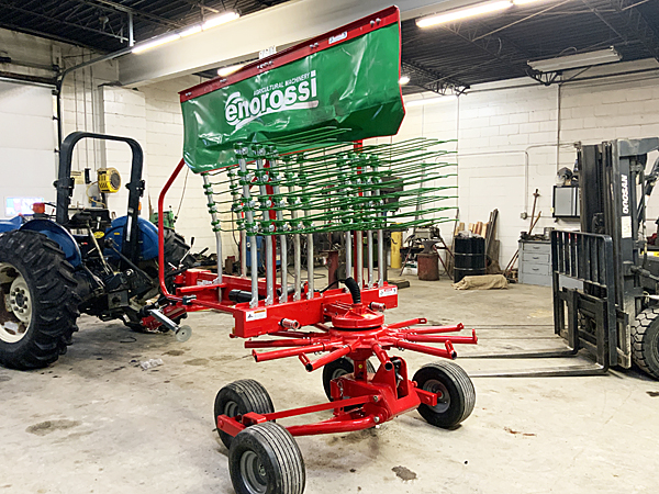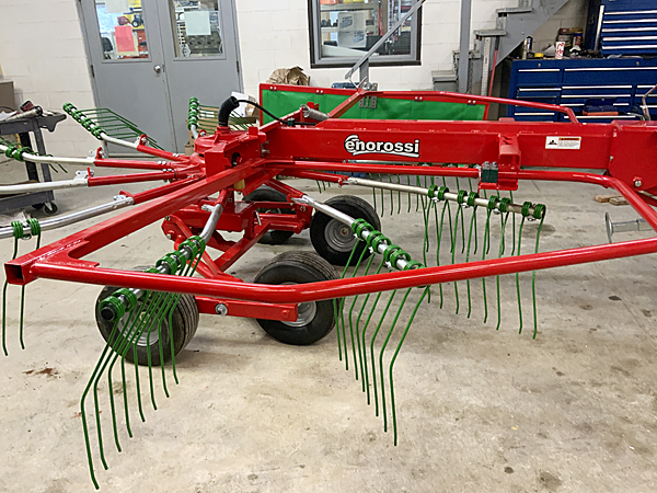 Description: New Enorossi RR420 EVO 13'9" single rotary rake, 11 arms with four tines per arm, 540 PTO, walking tandem axle with four 18.850-8 wheels/tires, hydraulic lift with screw crank height adjustment, left hand side windrow curtain, removable tine bars for narrow transport and storage, 6.5-foot transport width. Weighs 1,370 lbs. Lists @ $11,960, including factory freight and setup. We have three one unit in stock. 11/15/2025