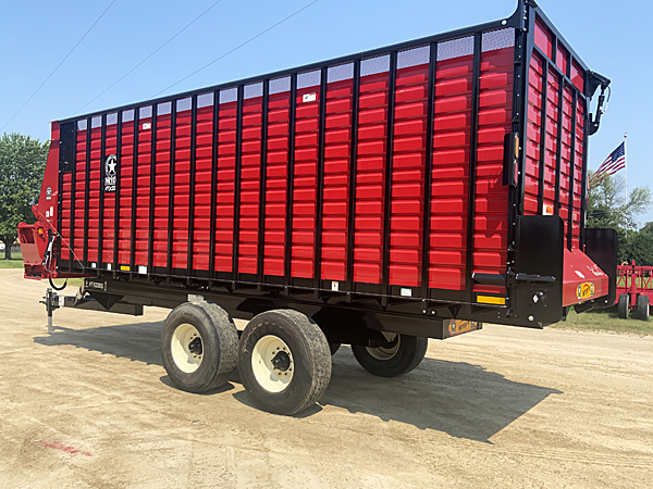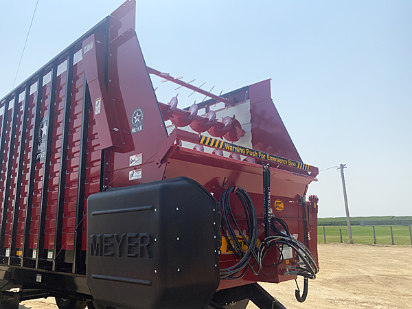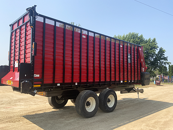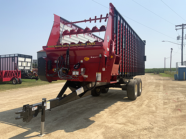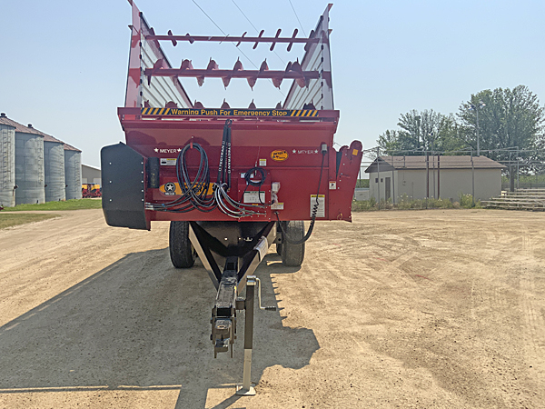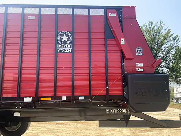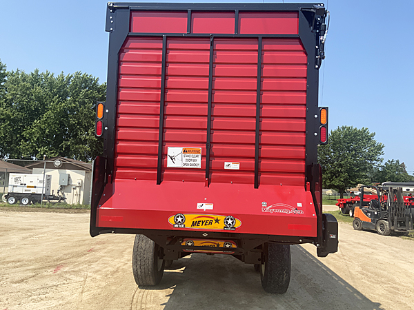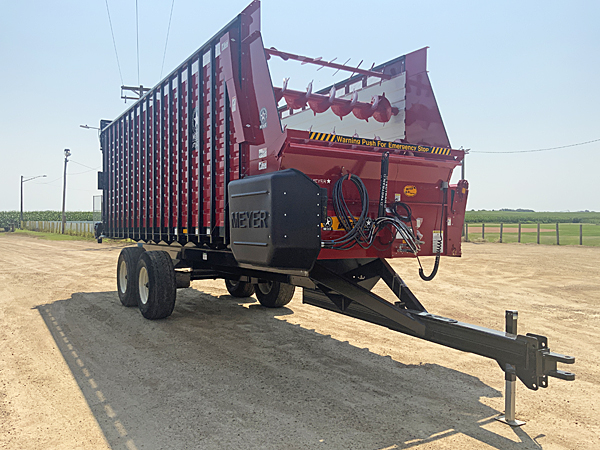 Description: 2024 Meyer 224-HC-Trail (replaces 6200 series) 24' front-rear unload all hydraulic drive forage box, independent outfeed clutch, heavy duty bevel RT gear drive, variable speed system, feather start augers, "Total Hydraulic In-Cab Control System", 667X main apron chains, 36" hydraulic fold down cross conveyor extension, left side unload, 4th beater system, rear gate delay, LED lights with hookup cord, tie down kit, less roof. Meyer XTH2200 22 ton tandem axle trailer, set of four 425X22.5 used truck tires mounted on 13X22.5 wheels, heavy duty clevis hitch, tongue jack. Lists @ $82,620. 08/11/2025