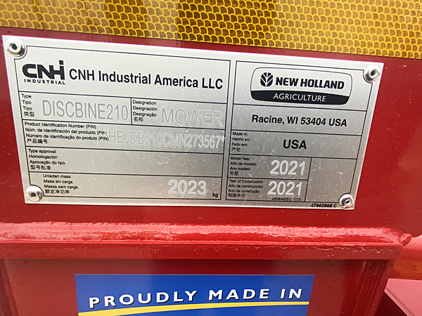Description: New New Holland 210R discbine mower conditioner, standard drawbar, 540 CV/PTO, rubber conditioner rolls, hydraulic head tilt, mow max cutter bar with quick change knives, 3 year cutter bar warranty, transport light package. Note: The discbine we had in stock has been sold, but we have a new unit on order. Please call for details. 08/08/2025