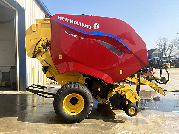 2024 New Holland Pro-Belt 460 commercial 4' X 6' baler, moisture sensor, 500/55-20 floatation tires, 25 knives, auto greasing, chain oiler, 1,000 PTO, service lights, heavy duty density system, ISOBUS with monitor, hydraulic pickup lift, four endless belts.