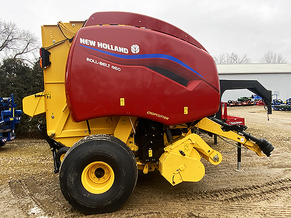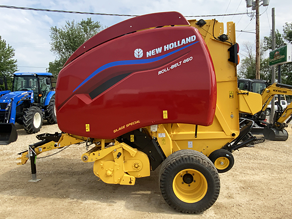 2024 New Holland 460 Silage Special Roll-Belt round baler, 4' X 6' bale size, net & twine, 540 rpm PTO, 19.0/45-17 14-ply tires, in-cab density system, moisture sensor, bale ramp, hydraulic pickup lift kit, 5 bar 1.8 m pickup, dual 4.80 X 8 pickup gauge wheels, roller windguard, clevis hitch.