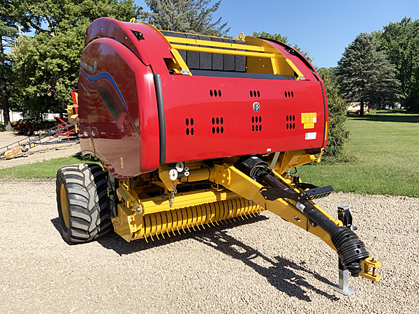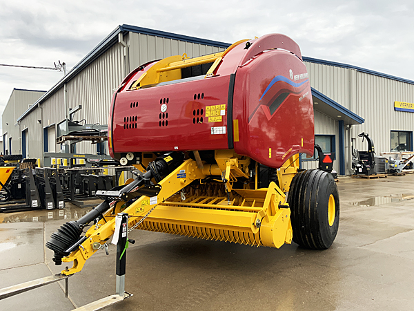 New 2024 New Holland 560 Specialty Crop Plus Roll-Belt round baler, endless belt, net/twine (Deluxe wrap), 550/45 22.5 tires, 1,000 PTO with cutout clutch, in-cab density system, bale ramp, belt-drive de-clutch, moisture sensor FF, hydraulic pickup lift, two 15X6.00-6 castering pickup wheels, 2.07m 5-bar pickup with roller windguard, clevis hitch.