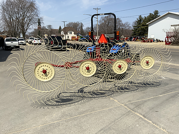 New Enorossi RR420 EVO 13'9" single rotary rake, 11 arms with four tines per arm, 540 PTO, walking tandem axle with four 18.850-8 wheels/tires, hydraulic lift with screw crank height adjustment, left hand side windrow curtain, removable tine bars for narrow transport and storage, 6.5-foot transport width. Weighs 1,370 lbs. Lists @ $11,960, including factory freight and setup.