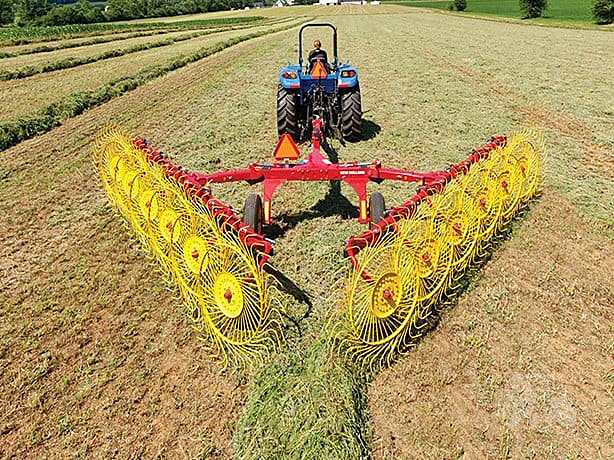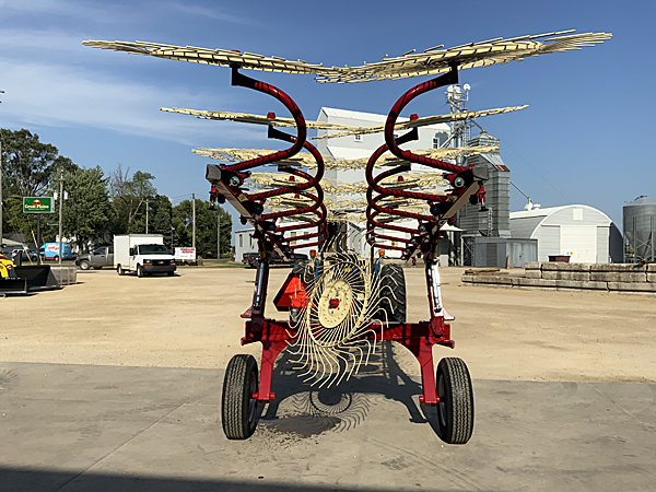 New 2023 Rhino (Sitrex) VR12 12-wheel V-Rake, one arm and spring per each rake wheel, optional center kicker wheel kit (kicker wheel kit shown in photos), new factory 205-75/15 highway tires, 24'6" max working width, 8'5" transport width, adjustable windrow width 3' minimum/6'7" maximum.