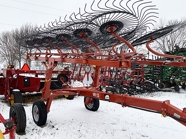 New 2025 New Holland Procart 1225 Plus 12-wheel high-capacity V-rake, walking tandem axle with new factory 205-75/15 high speed tires, 60" diameter rake wheels with 7.5mm diameter tines (60" diameter rake wheels turn more slowly for gentler handling of the crop), adjustable independent rake wheel flotation, single side opening allows lock-out of either the left side or right side for raking a single windrow. Both windrow width and raking width angle are adjustable on-the-go from the tractor seat by use of the electro-hydraulic control. Minimum rake working width 22', maximum width 25' 1'. Minimum windrow width 3'; maximum width 6' 7". Transport light package, tongue jack, SMV sign. Includes optional hydraulic dual center kicker wheel. Narrow transport width of 9' 2". Weighs 2,670 lbs. Requires minimum of 50 hp.