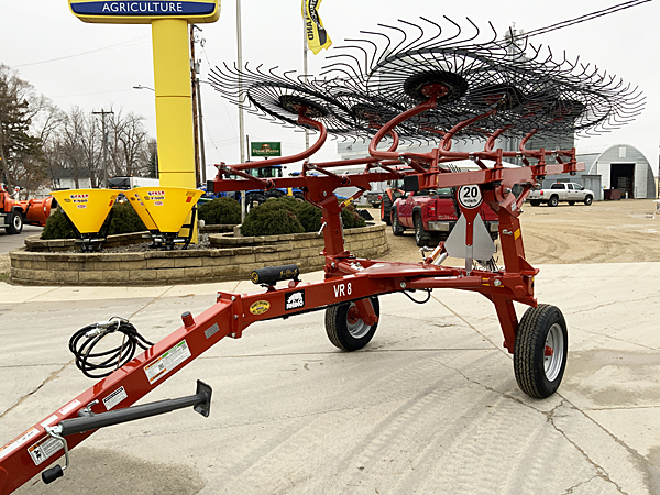 New 2023 Rhino (Sitrex) VR8 8-wheel V-Rake, one arm and spring per each rake wheel, optional center kicker wheel kit (kicker wheel kit shown in photos), new factory 205-75/15 highway tires, 18' max working width, 8'5" transport width, adjustable windrow width 3' minimum/6'7" maximum.