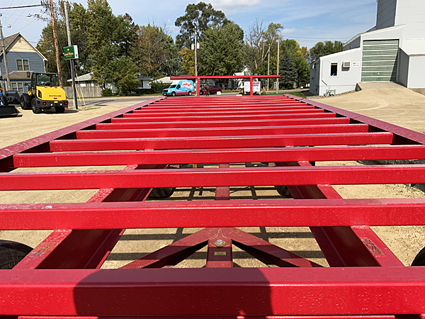 New JBM (John BM Mfg.) Mighty Bale Hauler 141939 round bale transport, 8.5 feet wide X 24 feet long, 245/70R19.5 14-ply rear tires, 8-bolt solid plate center rims, 245/70R17 10-ply front tires, 6-bolt solid plate center rims, greaseable front and rear wheel hubs, telescoping tongue, SMV sign, 8-bale capacity or 20,000 lbs., red color. New model for 2025.