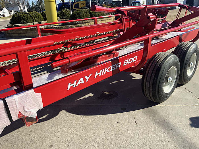 New 2024 Morris ProAG 900 Hay Hiker round bale transport. Hydraulic fork picks up the bales and loads the bales onto the dual bed. Push bar moves the two bales back to allow picking up and loading two more bales. Capacity is 12 48" wide bales or 8 60" wide bales. To unload bales, the bed is raised hydraulically. The push-off bar moves the bales to the rear, which then forces the tractor and bale transport forward out from underneath the bales. Four 8-bolt wheels with 11LX15 FI load range F tires. Transport lights. Safety tow chain. Weighs 5,377 lbs. Load capacity 13,623 lbs. Requires 120 hp tractor (minimum) with two sets of remote couplers. Length 29' 8½". List price $42,720, including factory freight to dealer and setup. To view video of 900 Hay Hiker in action, Click here.