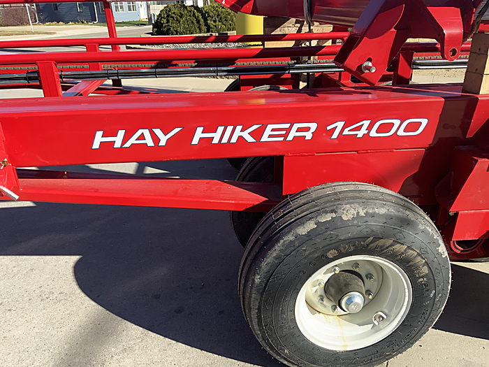 New 2024 Morris ProAG 1400 Hay Hiker round bale transport. Hydraulic fork picks up the bales and loads the bales onto the dual bed. Push bar moves the two bales back to allow picking up and loading two more bales. Capacity is 18 48" wide bales or 14 60" wide bales. To unload bales, the bed is raised hydraulically. The push-off bar moves the bales to the rear, which then forces the tractor and bale transport forward out from underneath the bales. Eight 8-bolt wheels with 11LX15 FI load range F tires. Transport lights. Safety tow chain. Weighs 7,455 lbs. Load capacity 29,000 lbs. Requires 180 hp tractor (minimum) with two sets of remote couplers. Length 44' 10". List price $62,485, including factory freight to dealer and setup. To view video of 1400 Hay Hiker in action, Click here.