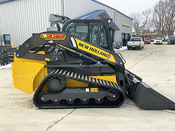 Description: New New Holland C332 track SSL, 2 speed, mechanical controls, cab with heat/AC/radio, air ride seat, hydraulic Q-tach plate, mechanical cab LCD display, engine block heater, steel lights with turn signals, performance with front electric multi-function, 450mm (17.7") tracks, 84" low-profile extended bucket with factory installed bolt-on cutting edge. We have three one unit in stock.