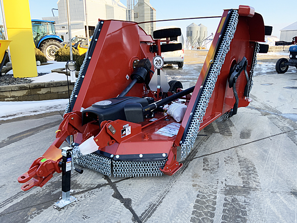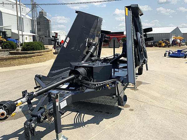 New Buhler Farm King Y1531C-8 15-foot flex-wing rotary cutter, 1,000 1⅜" CV PTO, set of eight laminated 21" solid rubber tires/rims, 1/2" X 4" uplift blades with stump jumper, 7 gauge welded steel deck with 1/4" thick side skirts, cutting height from 2" up to 15", wing working range + or - 25 degrees, slip clutch protection, requires 65 minimum horsepower, 250 hp center gearbox, 190 hp outboard gearboxes, 4" diameter cut capacity, 7" blade overlap, fully reversible/replaceable skid shoes, front and rear chain guards, Cat II swivel clevis hitch, tongue jack, PTO shaft holder, charcoal gray color, weighs 5,900 lbs., 5-year warranty on gear boxes, 1 year full machine warranty. Lists @ $30,630, including factory freight to dealer and setup.