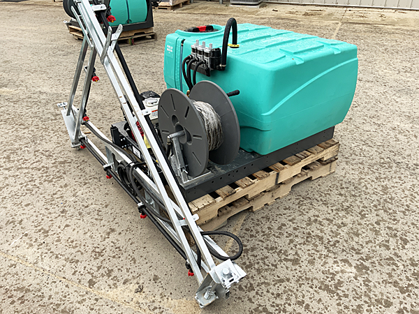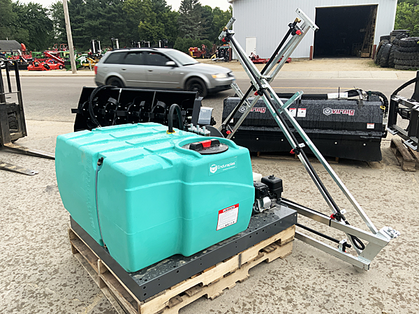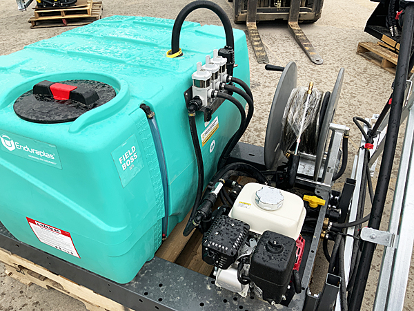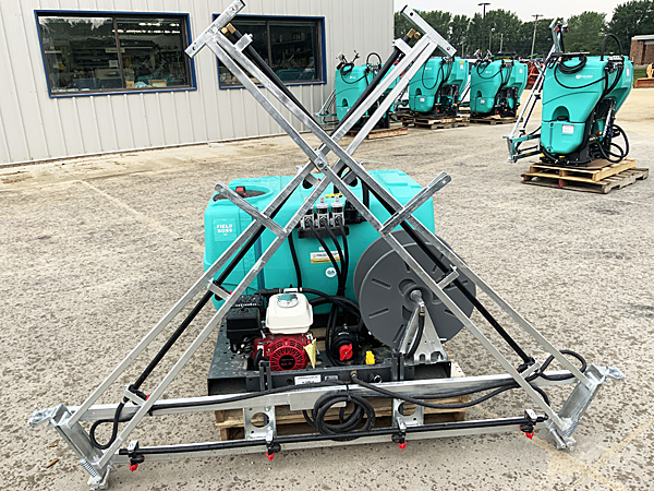 Description: New Enduraplas SFB100FG225GH-ES Field Boss 365 100-gallon UTV skid platform sprayer, Honda GX120 4 hp engine, centrifugal pump, hose reel with 50 feet of hose and hand wand, 3 electric solenoid valves, control box and pressure regulator valve, 20-foot manual X-fold galvanized boom with 12 nozzle bodies on 20" spacing, includes diaphragm bodies with 110-degree #2 (yellow) spray tips. The 20-foot boom is extendable to a 30-foot boom by adding kit # ASBSX Kit - add $355. Note: This UTV sprayer has been sold, but please call for current price and availability of a new unit. 07/14/2023