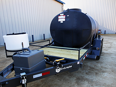 New 2023 Enduraplas STNT1200-LD 1,200-gallon tank on DOT highway trailer, two 7,000 pound axles with four wheel electric brakes with optional four-foot wood deck for tote etc., DOT lights and reflective tape, trailer ball hitch (clevis hitch available), two safety tow chains, tongue jack, heavy duty fenders, tank has full length channel sump, set of four 235/80R16 LRE highway speed tires, Honda GX160 5.5 hp engine with recoil start, 2" poly pump, 2" standard complete plumbing with ball valves, poly pump cover. Includes optional chemical inductor mounted and plumbed to trailer, plus the optional recirculation kit. Gray trailer with black tank. This is a loaded tank/trailer combination.