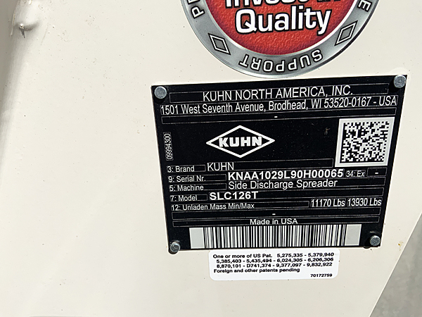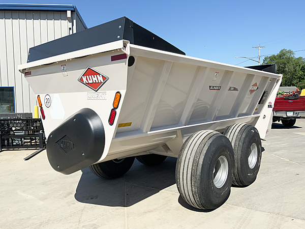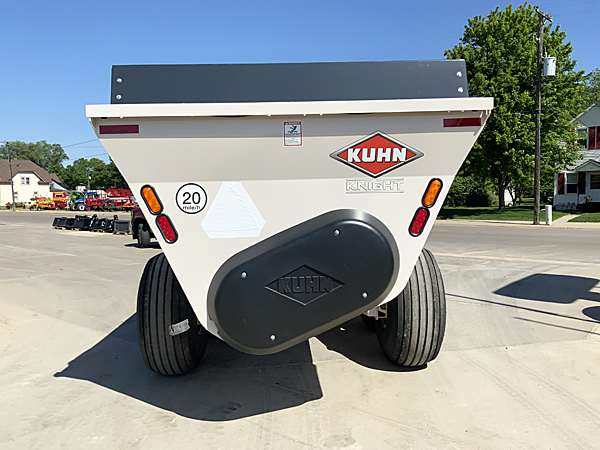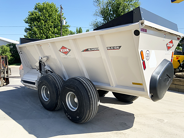 Description: New Kuhn Knight SLC126T tandem axle side-discharge spreader, 19LX16.1 18-ply flotation tires, front and rear splash guards, clevis hitch, 1 3/8" 1,000 PTO with slip clutch, approximately 550 bushel capacity, 2,600 gallon, 18 hammers. Note: This spreader has been sold, but please call for current price and availability of a new unit.
