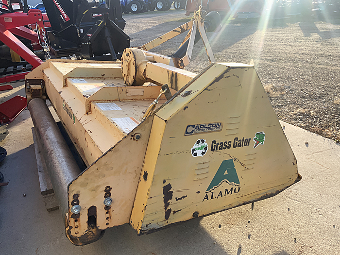 Description: Used Alamo Industrial GG74 Grass Gator twin-flail mulching mower, 74" cutting width, two flail shafts with 184 knives per each shaft, rotation of front shaft is forward, rotation of rear shaft is reverse, 6" diameter full-width rear roller adjustable from 0" to 6" cutting height, full-length replaceable skid shoes, 540 PTO 60 hp gear box, double C belt-driven flail shafts, requires tractor with minimum of 30 hp. All new knifes and drive belts recently installed. Serviced through our shop. For cutting grass, leaves and light brush. Includes parts & operator manuals.