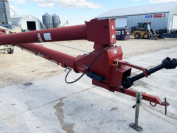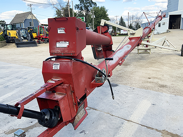 Description: 2007 Buhler Farm King Y1060TMM 10" X 60' gear-drive low-profile swing hopper auger, hydraulic scissor lift transport, one owner, paint is faded, good original flighting. Serviced through our shop. New tires just installed.