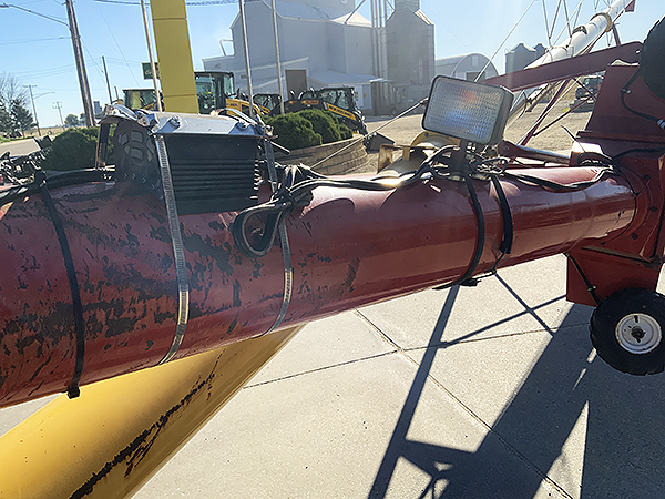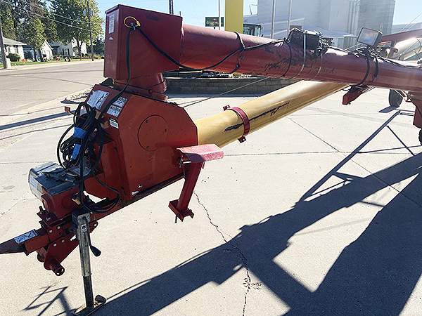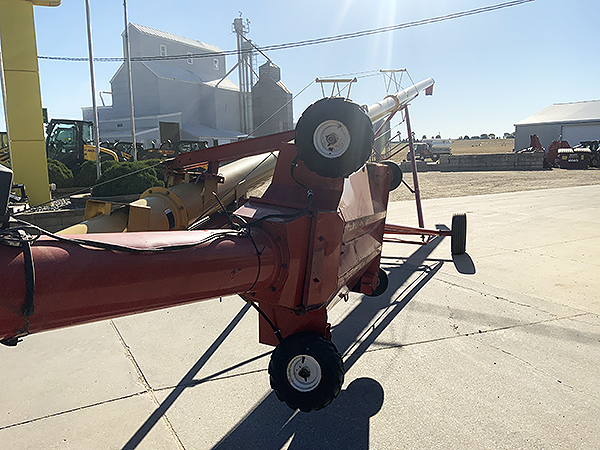 Description: Used Westfield MK100-61 10" X 61' gear-drive low-profile swing hopper auger, hydraulic lift, includes the A200/A293 right-angle drive kit. The gearbox can be installed to the right side (as shown) or the left side. Optional: can remove the right-angle drive kit if not needed and install the in-line CV PTO shaft (not included). Has the electric hopper mover kit with light and a remote control. Good flighting. Auger has been serviced through our shop.