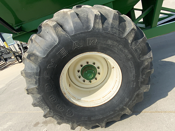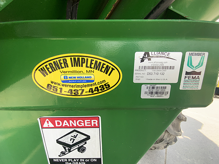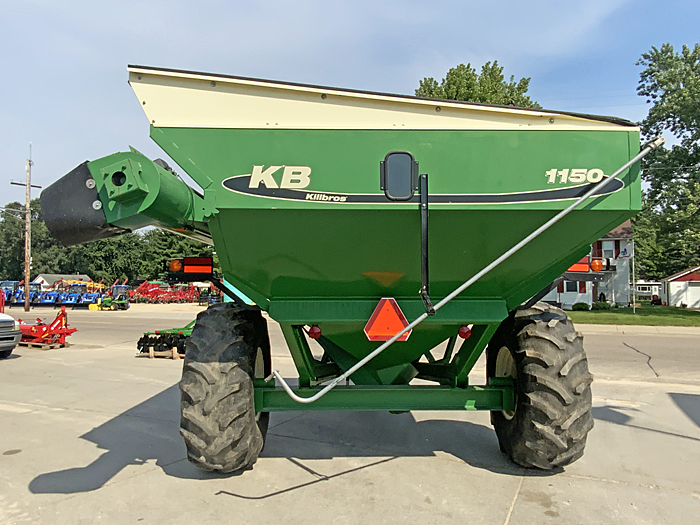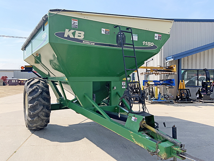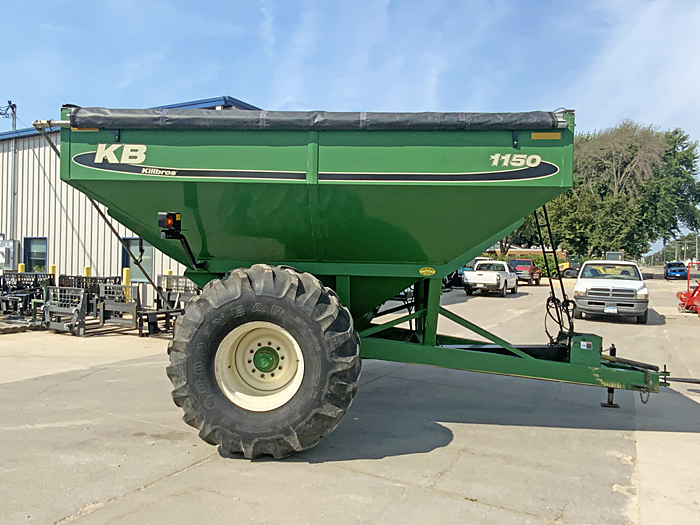 Description: Used 2012 Killbros 1150 14" corner auger grain cart, 500-plus bushel capacity, very good original flighting, 120" rigid axle, Goodyear 23.1X26 R1 tires, roll tarp kit, 1,000 RPM PTO, transport light. Very clean, straight grain cart.