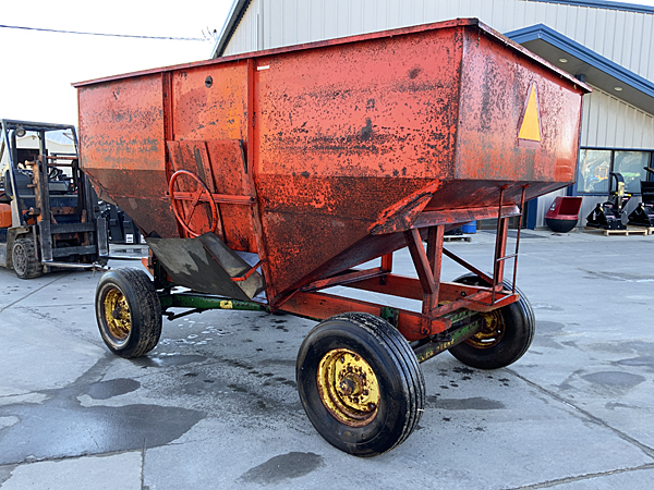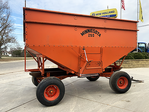 Used Minnesota 250 gravity box with 12" extension sides, ladder on both front and rear, right side unload (box can be turned to unload on left side), Minnesota 1078 10-ton wagon gear, set of four 11LX15 8-ply implement tires, extension tongue. Original paint on box and wagon gear. One owner. Sharp, like-new unit. Will hold approximately 310 bushels.