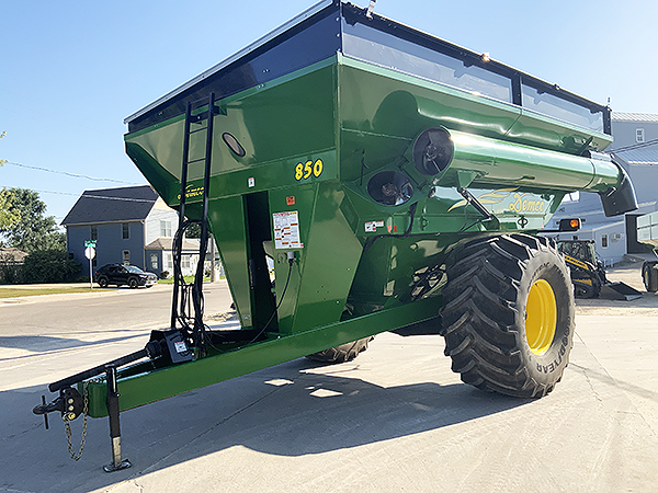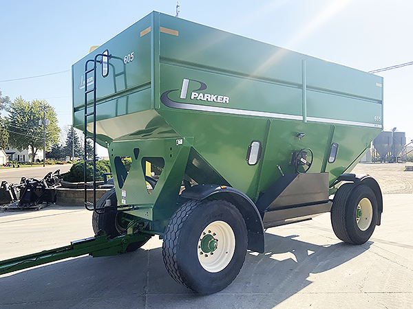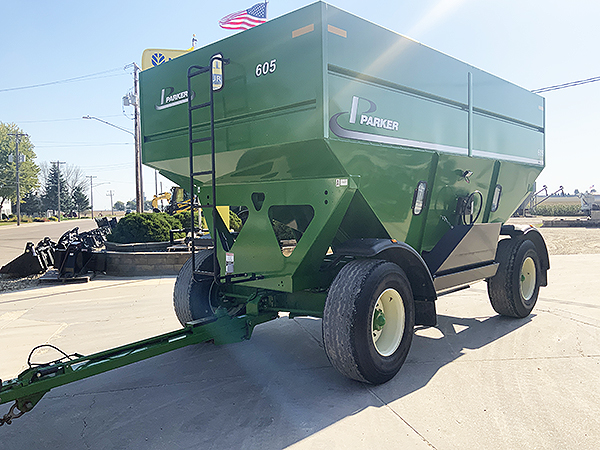 Used Parker 605 625-bushel grain wagon, 425X22.5 used truck tires on 10-bolt heavy duty rims, 4-wheel brakes, factory fender kit with clearance lights, transport lights with left side unloading light, contoured frame for 33% tighter turn, safety tow chain. Very clean. sharp unit. Serviced through our shop.