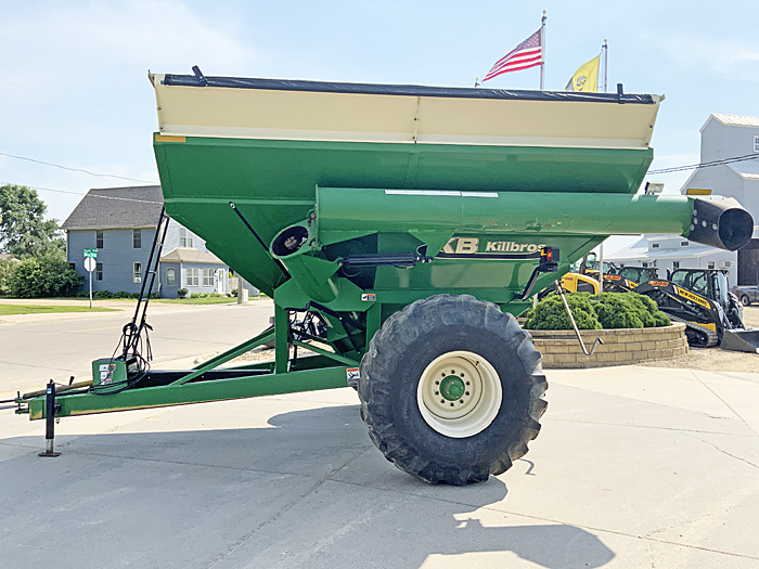 Used 2012 Killbros 1150 14" corner auger grain cart, 500-plus bushel capacity, very good original flighting, 120" rigid axle, Goodyear 23.1X26 R1 tires, roll tarp kit, 1,000 RPM PTO, transport light. Very clean, straight grain cart.
