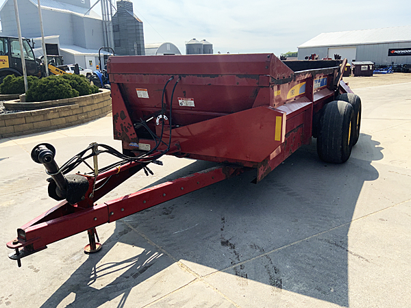 Used H&S 3143 430-bushel tandem axle box manure spreader, two-speed mechanical drive apron with cleanup, hydraulic endgate with two cylinders, upper beater, 16.5LX16.1 flotation tires, T-rod apron chain, 540 rpm PTO. Low usage, one-owner spreader. Serviced through shop. Like new condition.