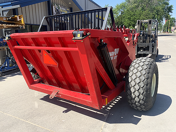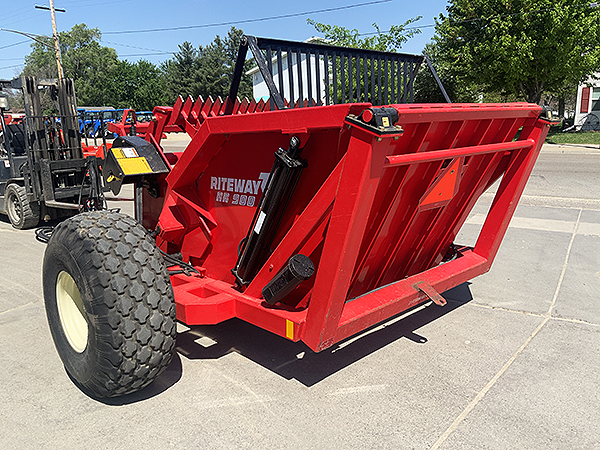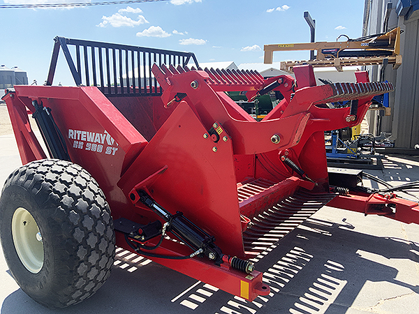 Description: Used Rite Way RR 900 ST rock picker,16.5LX16.1 tires, electro-hydraulic rake/bucket control, rock deflector, hose/harness holder, hydraulic swing hitch and tongue jack, three-bat rotary reel with hard-surfaced bat teeth, 3.2 cubic yard capacity, weighs 4,784 lbs. Low usage; like-new condition. Serviced through shop.