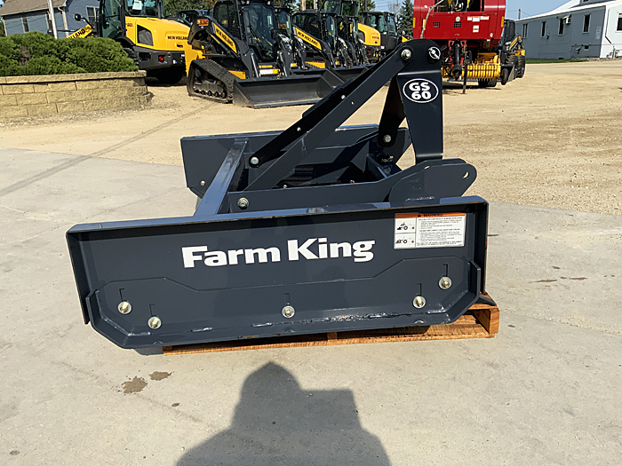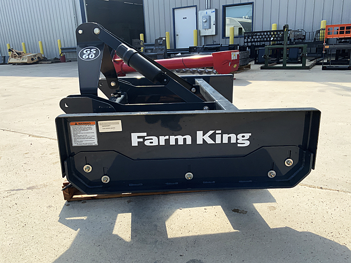 Description: New Buhler Farm King 60" 3 pt. grading scraper, two blades reversible with 1/2" X 6" cutting edge, 18" blade spacing, reversible/replaceable steel skid shoes, 4 adjustable scarifier shanks with four depth settings, Cat I/II quick hitch compatible, 20-55 hp required, length 49", height 34", weighs 534 lbs., charcoal color, list price $2,222, plus shipping. 09/15/2025