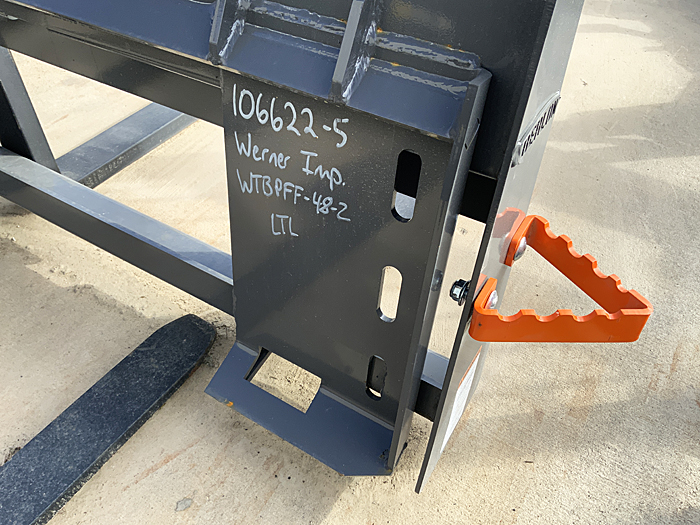 Description: Berlon WTBPFF-48-2 48" 5,500 lb. pallet fork set, Class II walk-through design with uni SSL-mount plate and a step on both sides. Forks are made in the U.S. We have nine seven units in stock. 10/30/2025